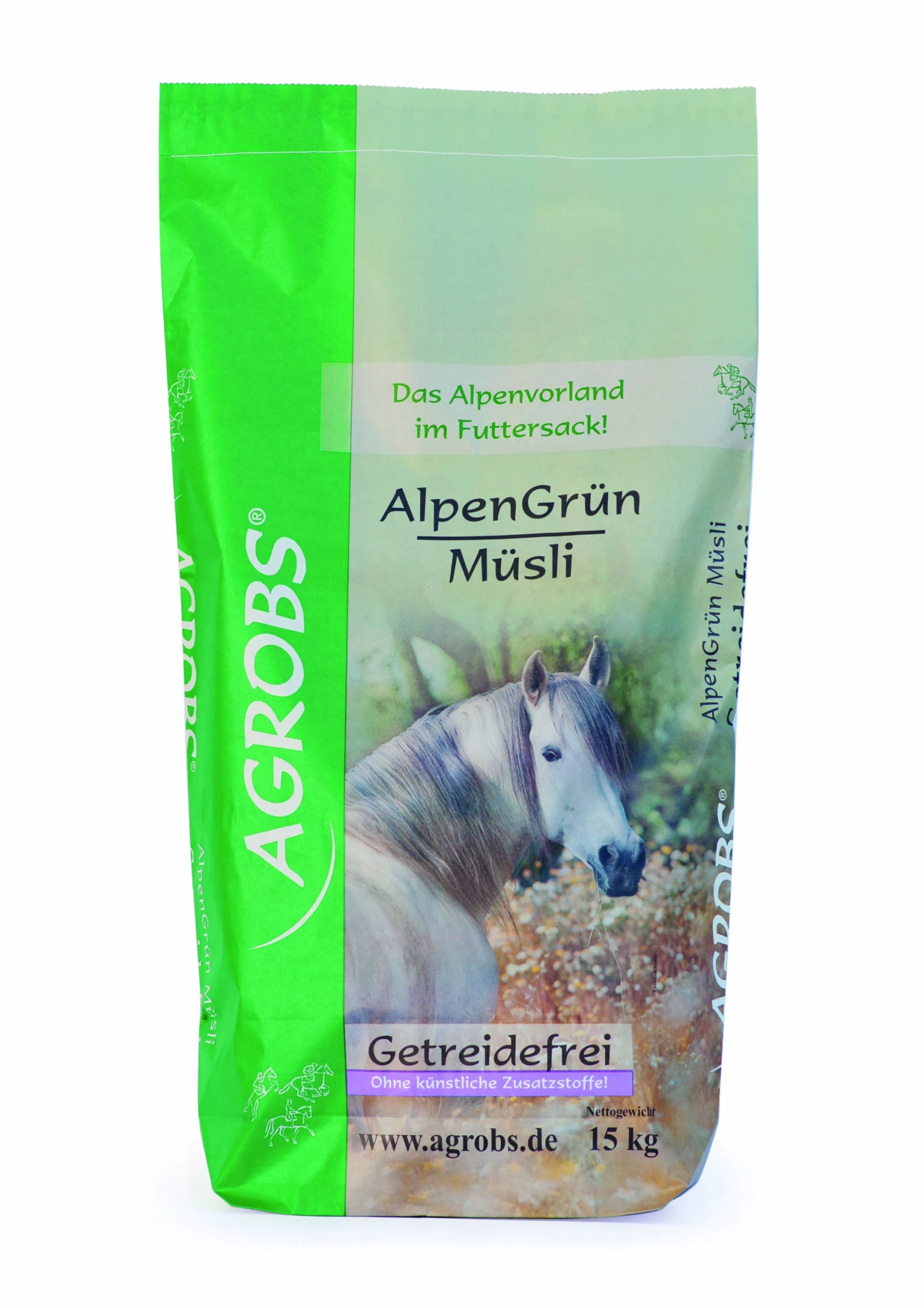 Für AlpenGrün Müsli von AGROBS werden Gräser und Kräuter artenreicher Wiesen zum optimalen Erntezeitpunkt gemäht und anschließend schonend mit Warmluft getrocknet. So bleibt die Faserstruktur erhalten. AlpenGrün Müsli gewährleistet damit nicht nur eine optimale Rohfaserversorgung, die Struktur fördert zudem die Kautätigkeit und unterstützt die Darmgesundheit. Ringelblumen- und Kornblumenblüten, Himbeer- und Brombeerblätter sowie Hagebutte liefern eine Vielzahl an natürlichen Vitalstoffen. Sonnenblumenkerne, Leinsamen und Schwarzkümmel dienen als Quelle essentieller Fettsäuren: die enthaltenen Schleimstoffe begünstigen zudem die Verdauung.