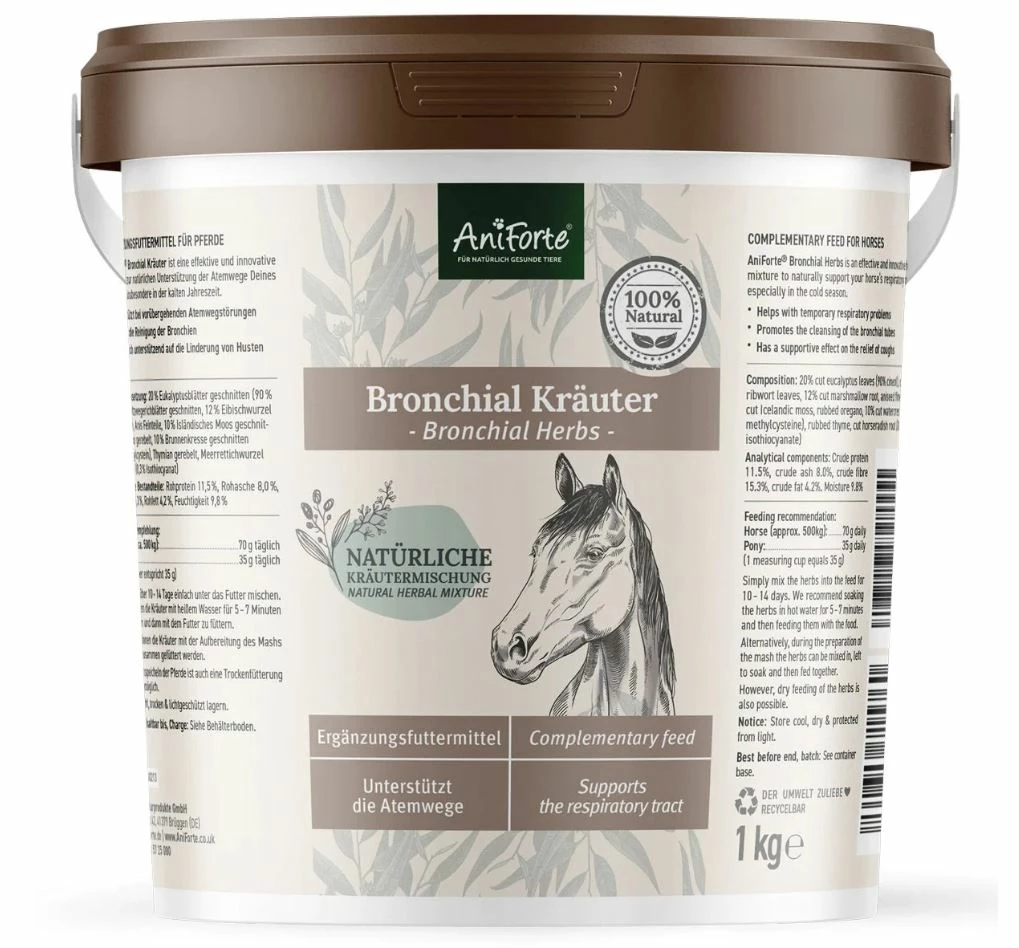 Die Mischung macht es bei unseren AniForte Bronchial Kräutern. Aus hochwertigen Kräutern haben wir eine besonders effektive Kräutermischung als Ergänzung zum täglichen Futter Deiner Pferde entwickelt. Enthalten sind Eukalyptus, Eibischwurzel, Thymian, Spitzwegerich und isländisches Moos. Abgerundet werden die Kräuter für Pferde von Brunnenkresse, Meerrettich, Oregano und Anis.