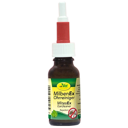 MilbenEx Ohrreiniger ist eine Komposition ätherischer Ă–le zur Abwehr von Ohrmilben und zur Reinigung und Pflege von gereizten und empfindlichen äuĂźeren Gehörgängen bei Hunden, Katzen und anderen Heimtieren.Â