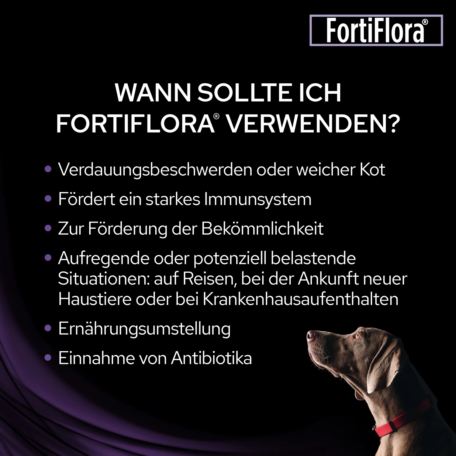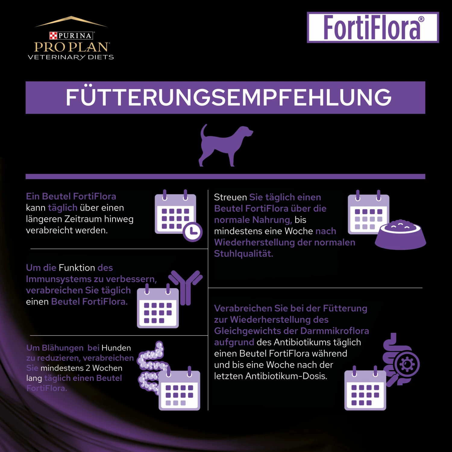 PURINA PRO PLAN FortiFlora Canine wurde für Hunde aller Altersklassen entwickelt und dient der Verbesserung der Kotqualität, Reduktion von Blähungen und der Unterstützung des Verdauungstraktes und Immunsystems.
