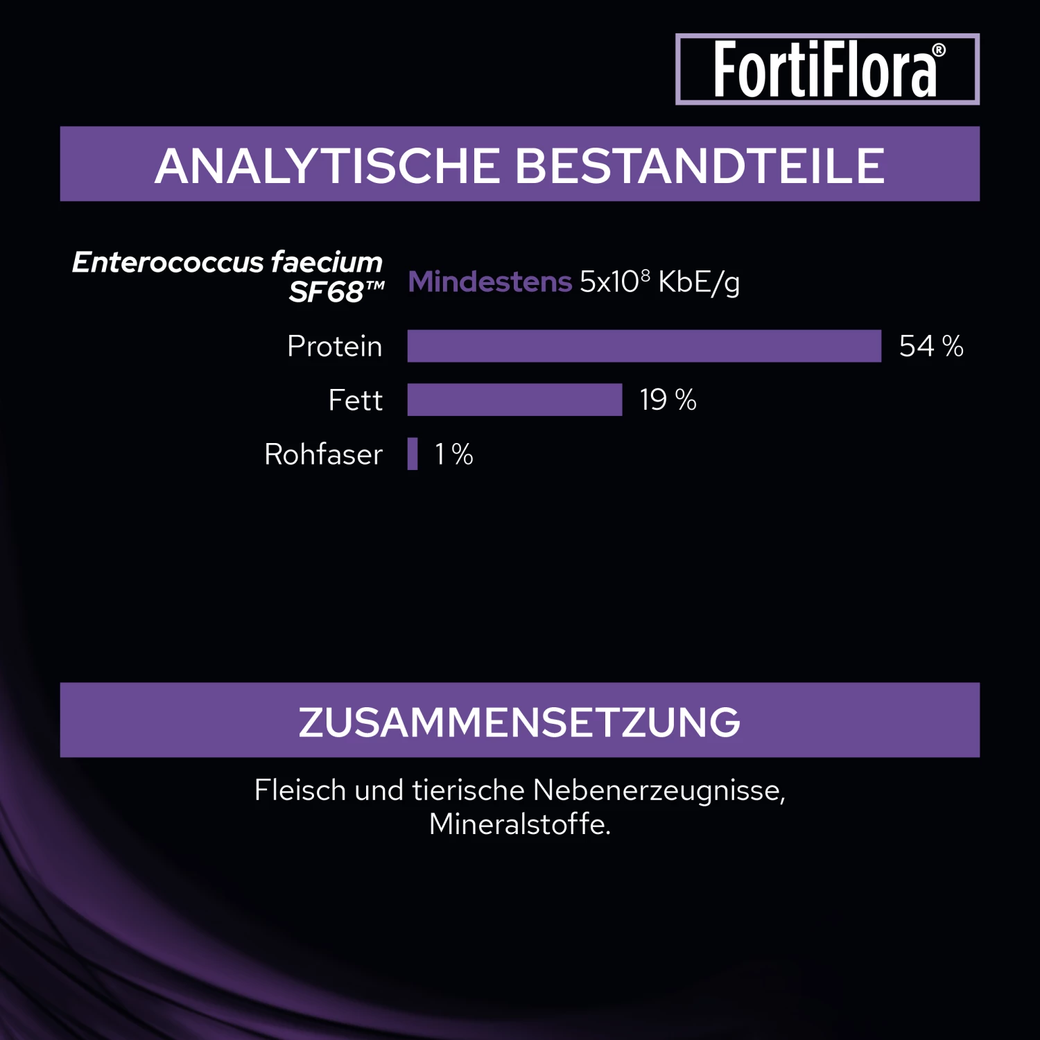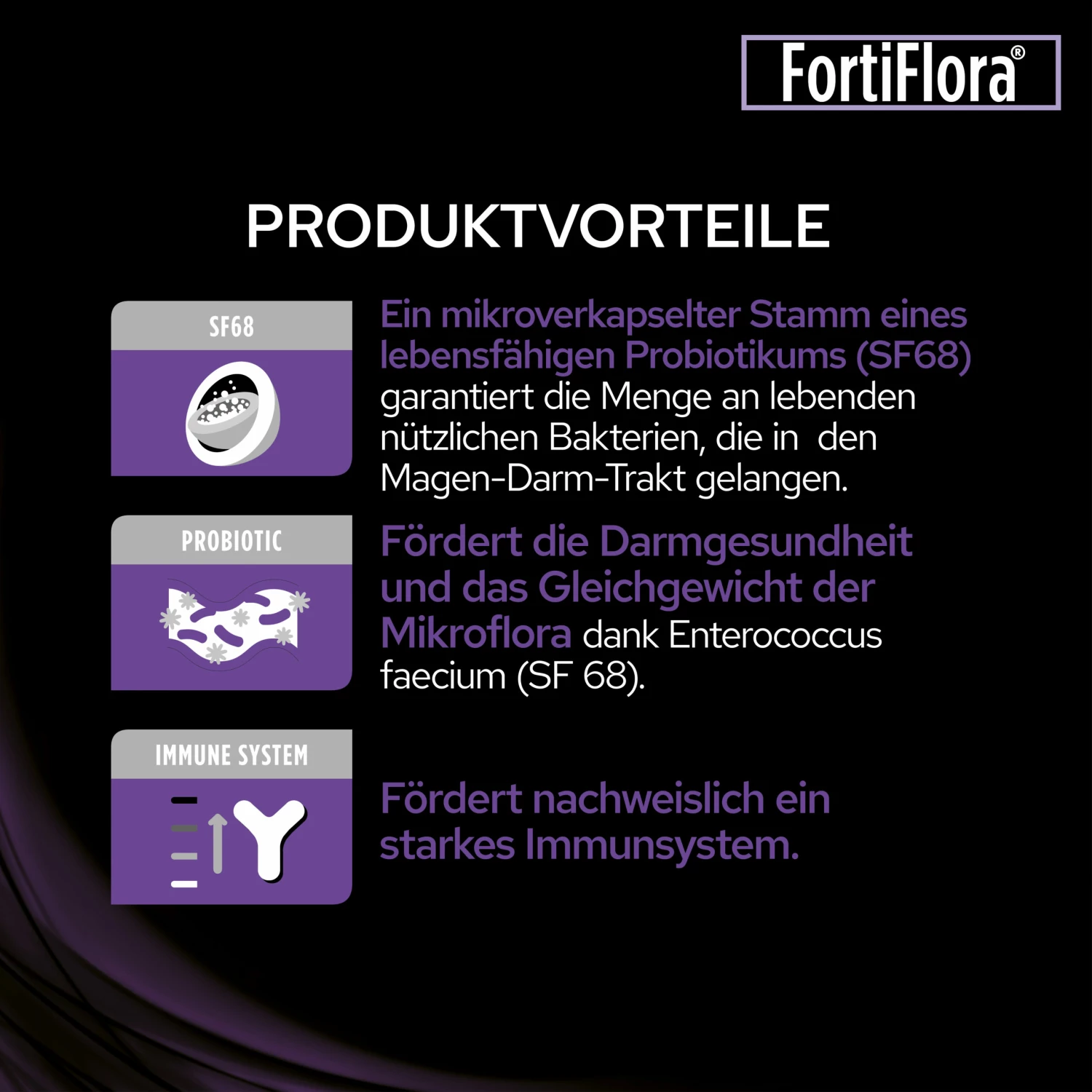 PURINA PRO PLAN FortiFlora Canine enthält Enteroccus faecium (SF68™) (4b1705), ein endosymbiontisches Milchsäurebakterium, welches die Konzentration nützlicher Bifidobakterien und Laktobazillen erhöhen 1,2 und die Konzentration schädlicher Clostridium perfringens Bakterien verringern 2,3 kann.