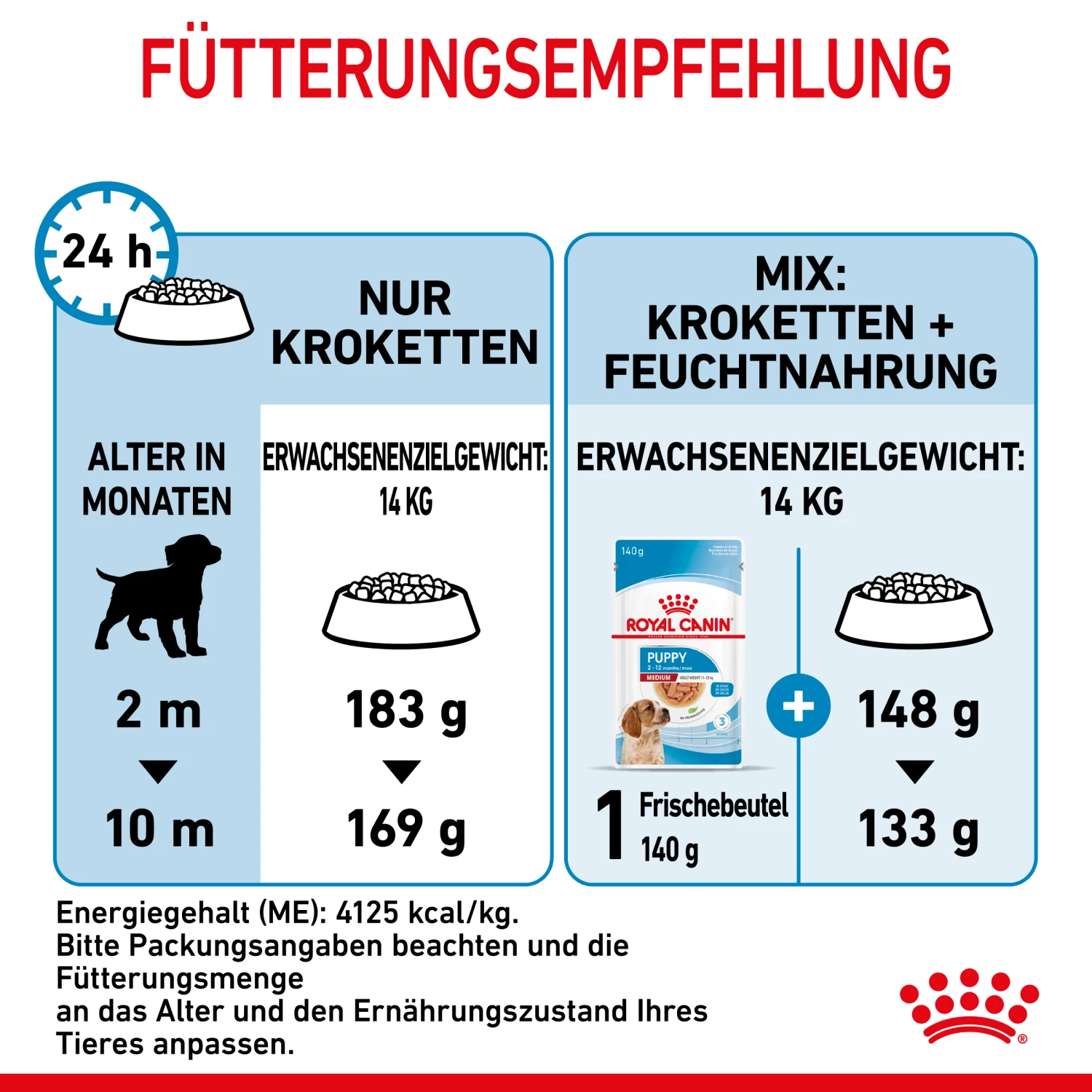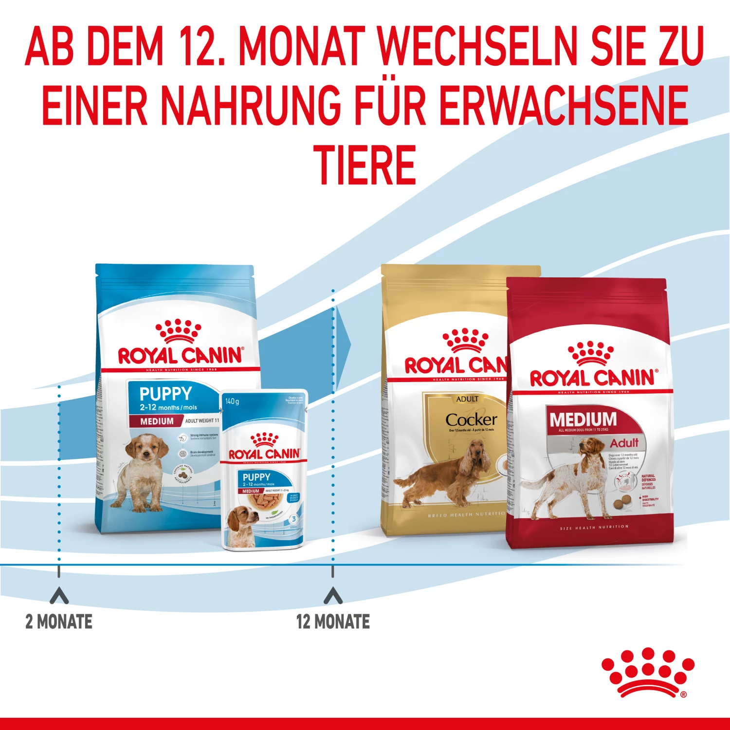 Das Wachstum ist eine wesentliche Lebensphase für Ihren Welpen – es ist die Zeit großer Veränderungen und neuer Entdeckungen. Während dieser entscheidenden Zeit benötigt ein Welpe eine vollwertige und ausgewogene Ernährung mit Nährstoffen, die eine optimale und anhaltende Gesundheit unterstützen, während er wächst und sich entwickelt. ROYAL CANIN Medium Puppy ist speziell auf die Ernährungsbedürfnisse eines Welpen mittelgroßer Rassen abgestimmt. Das Futter eignet sich für mittelgroße Hundewelpen bis zum 12. Monat mit einem Endgewicht zwischen 11-25 kg geeignet.