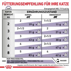 Bitte besprechen Sie mit Ihrer Tierärztin oder Ihrem Tierarzt, welche Nahrung für Ihr Tier am besten ist. Eine Nahrungsumstellung sollte sorgfältig und schrittweise über einen Zeitraum von 7–10 Tagen erfolgen. Achten Sie auf die korrekte Portionsgröße – insbesondere bei Mischfütterung.